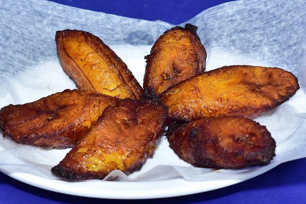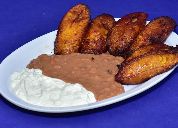 SWEET FRIED PLANTAINS WITH SOUR CREAM AND REFRIED PINTO BEANS